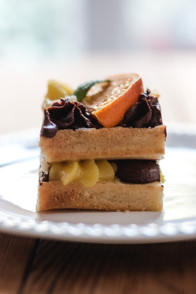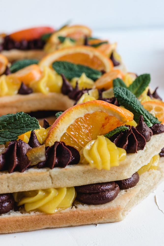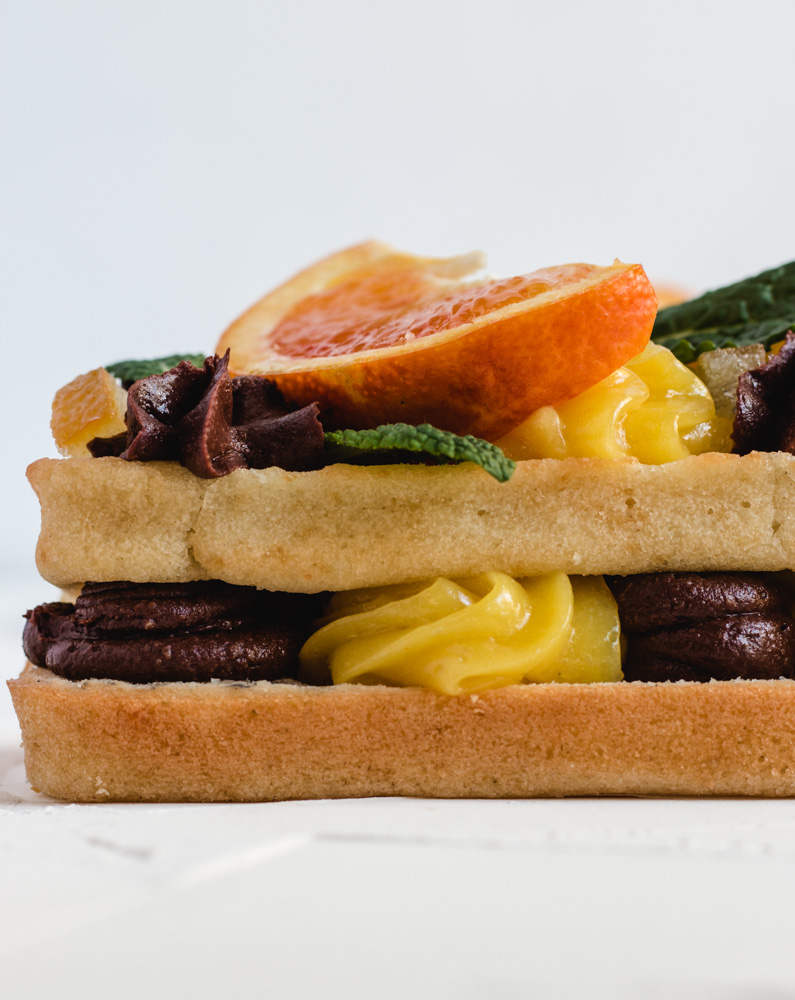 Positionnez délicatement le deuxième étage de chaque génoise, et continuez à les garnir avec les crèmes, et les agrumes de votre choix.