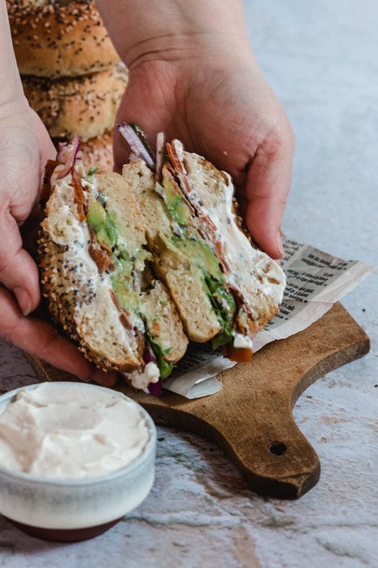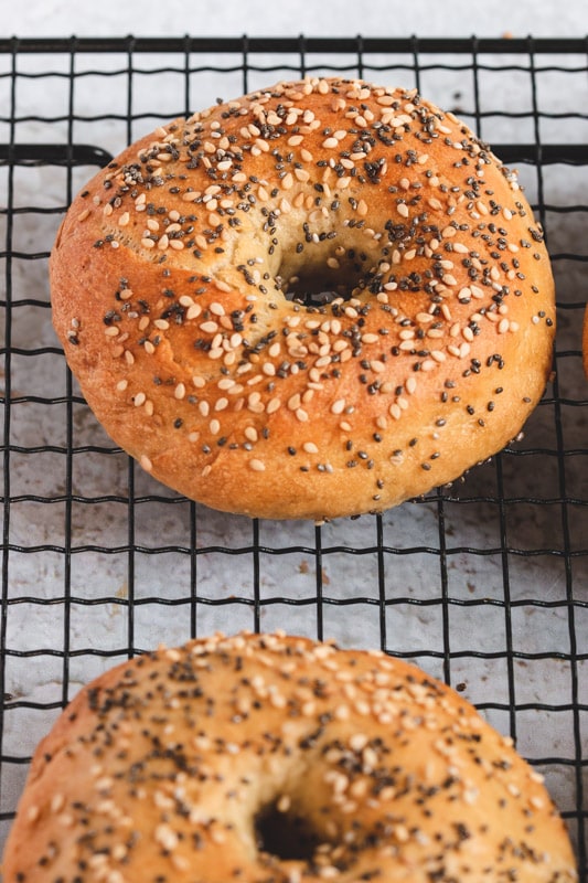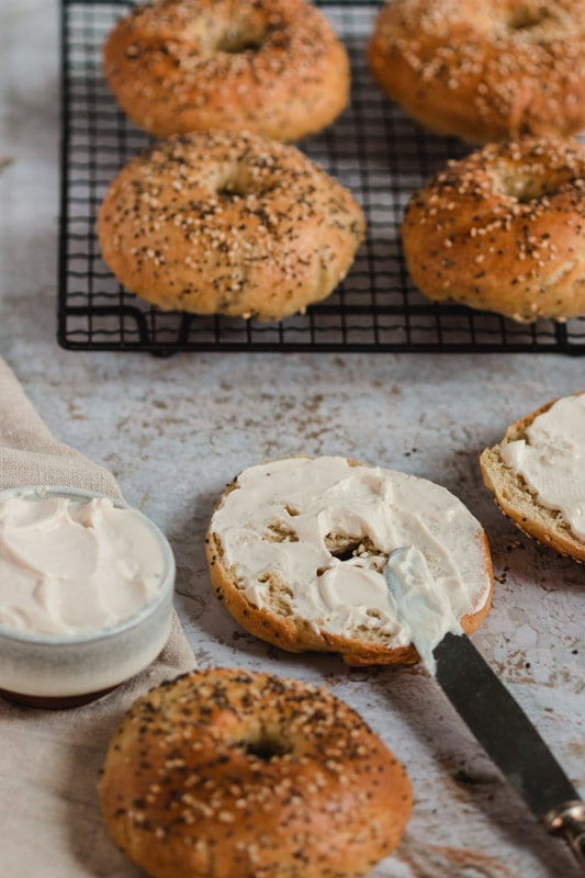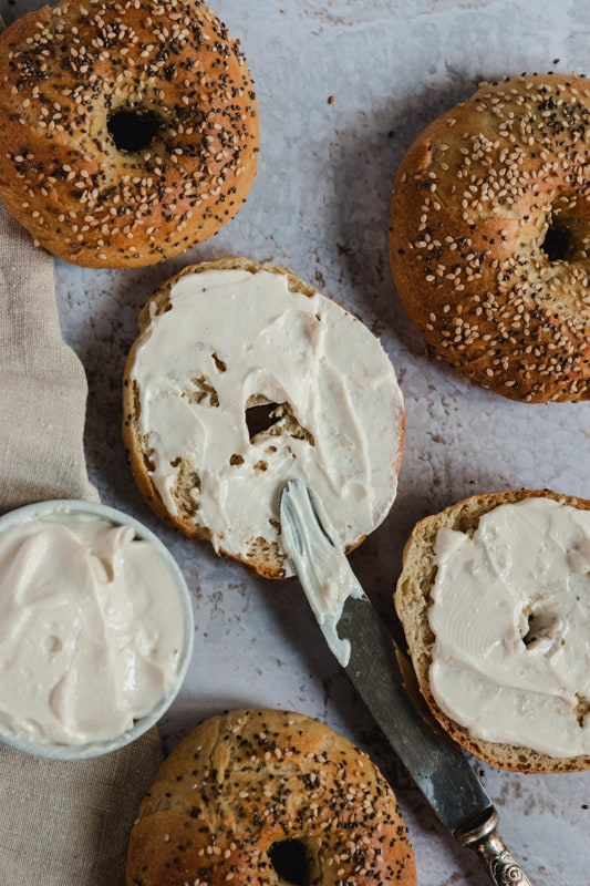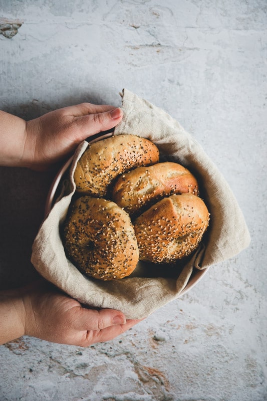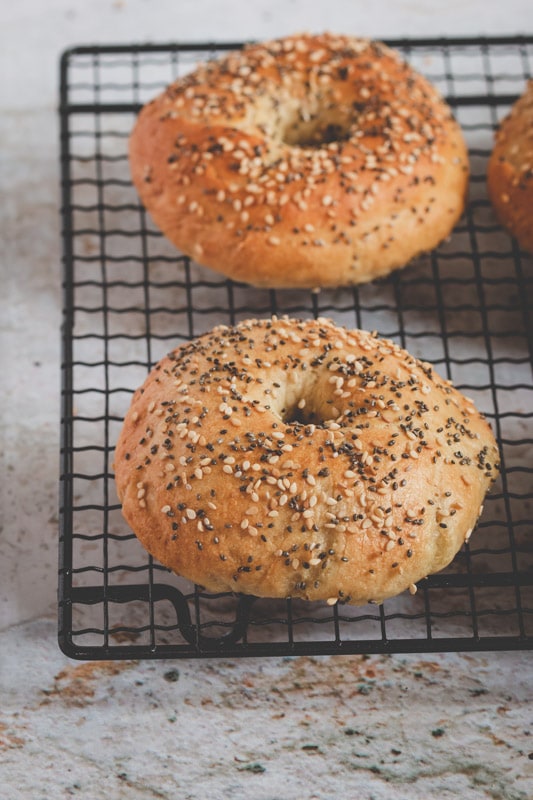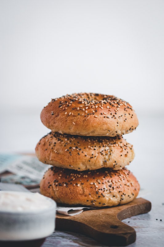 Comme toutes les pâtes levées, il n’y a pas de difficulté particulière dans la recette, il faut juste de la patience car il y a 2 levées (de 1 ou 2h, selon la température de la pièce). mais la bonne nouvelle, c’est que ces pains à bagel véganes se congèlent très bien. Je les coupe en deux une fois cuits, puis les mets ainsi au congélateur. Pour les décongeler, je les passe au grille pain ou au four quelques minutes, et ils sont prêts à être utilisés ! C’est super pratique, et ça vaut le coup d’en faire une grosse fournée pour en avoir d’avance.
