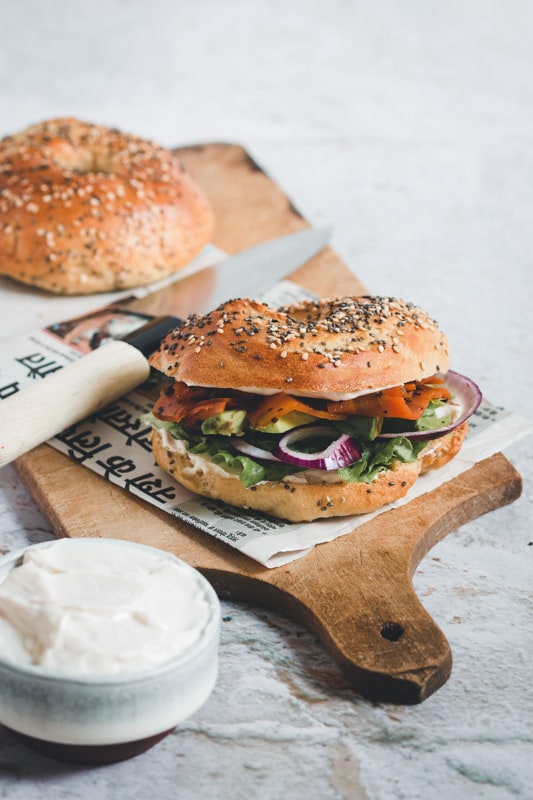 La particularité du pain à bagel, c’est qu’il est poché dans un bain d’eau et de bicarbonate de soude avant d’être cuit au four. Cela lui confère son caractère crousti-moelleux absolument irrésistible ! Le bagel est originaire de Pologne, mais il est plus connu pour ces versions nord-américaines (Etats-Unis et Canada). Il est traditionnellement garni de fromage frais, et d’autres choses absolument pas véganes. Pour cette fois ci, je l’ai garni de salade, oignon rouge, fromage frais de soja façon cream cheese et carottes façon saumon fumé. c’est un délice ! Mais c’est vraiment un pain que l’on peut garnir avec à peu près tout ce que vous avez dans votre frigo, n’ayez pas peur d’expérimenter !