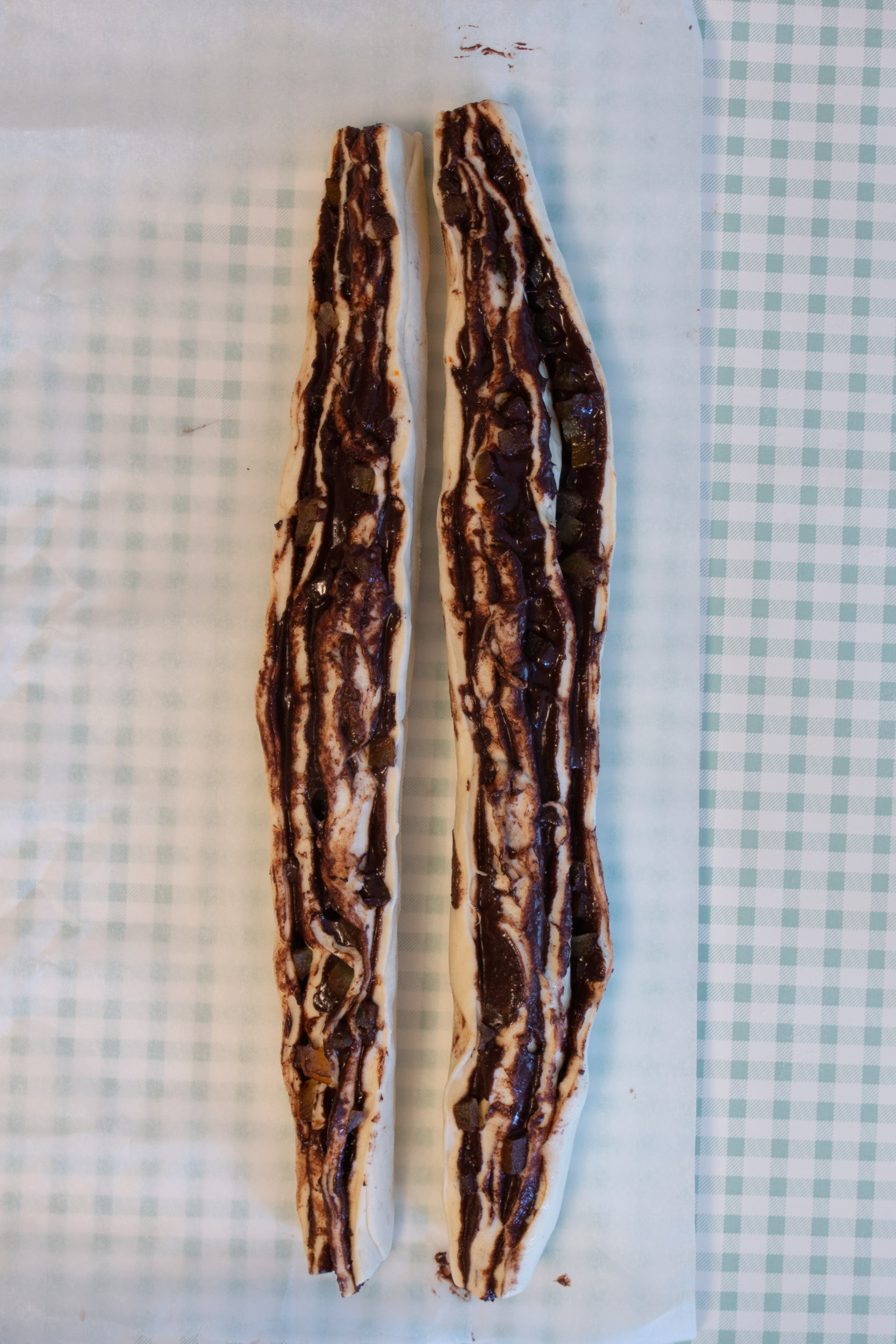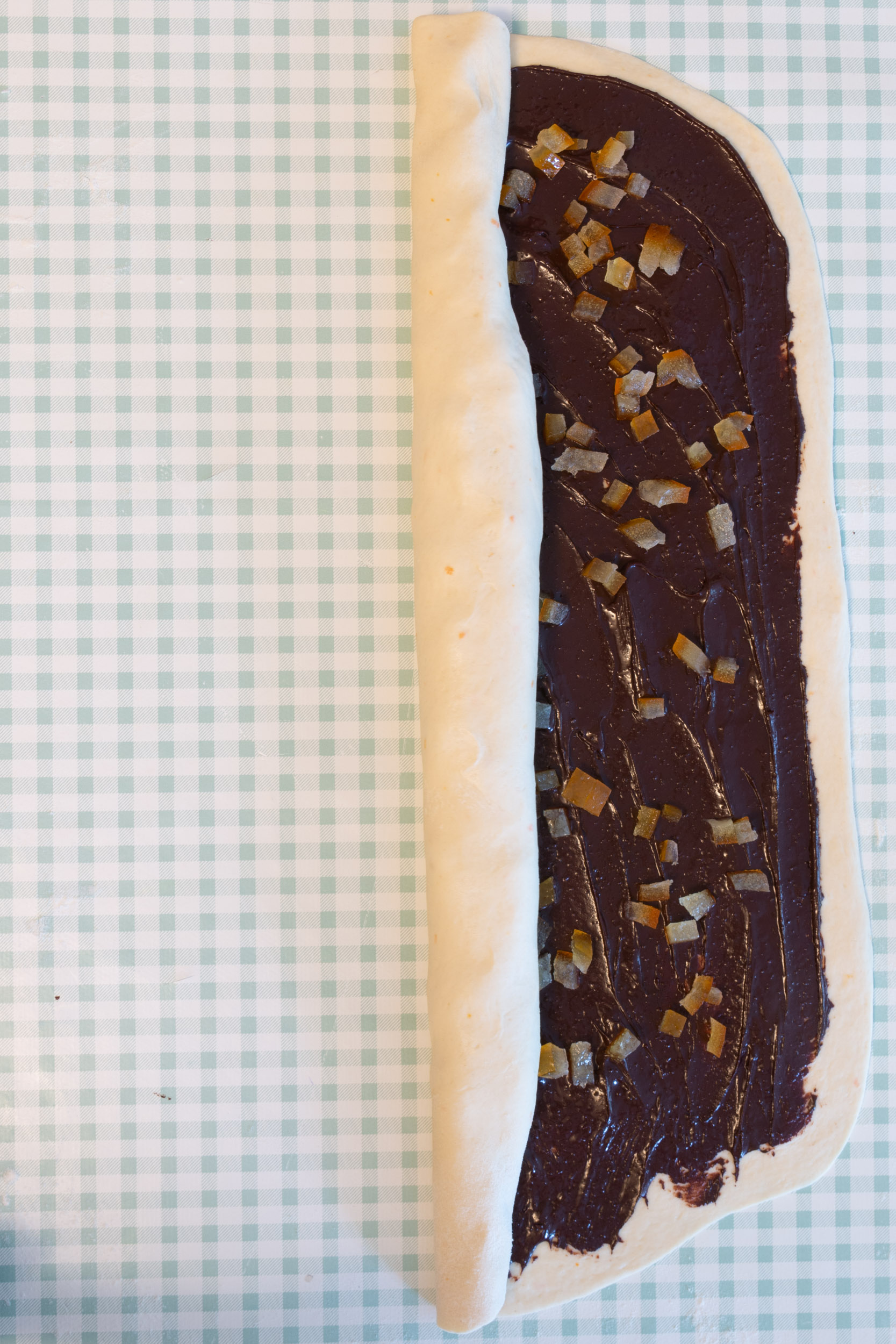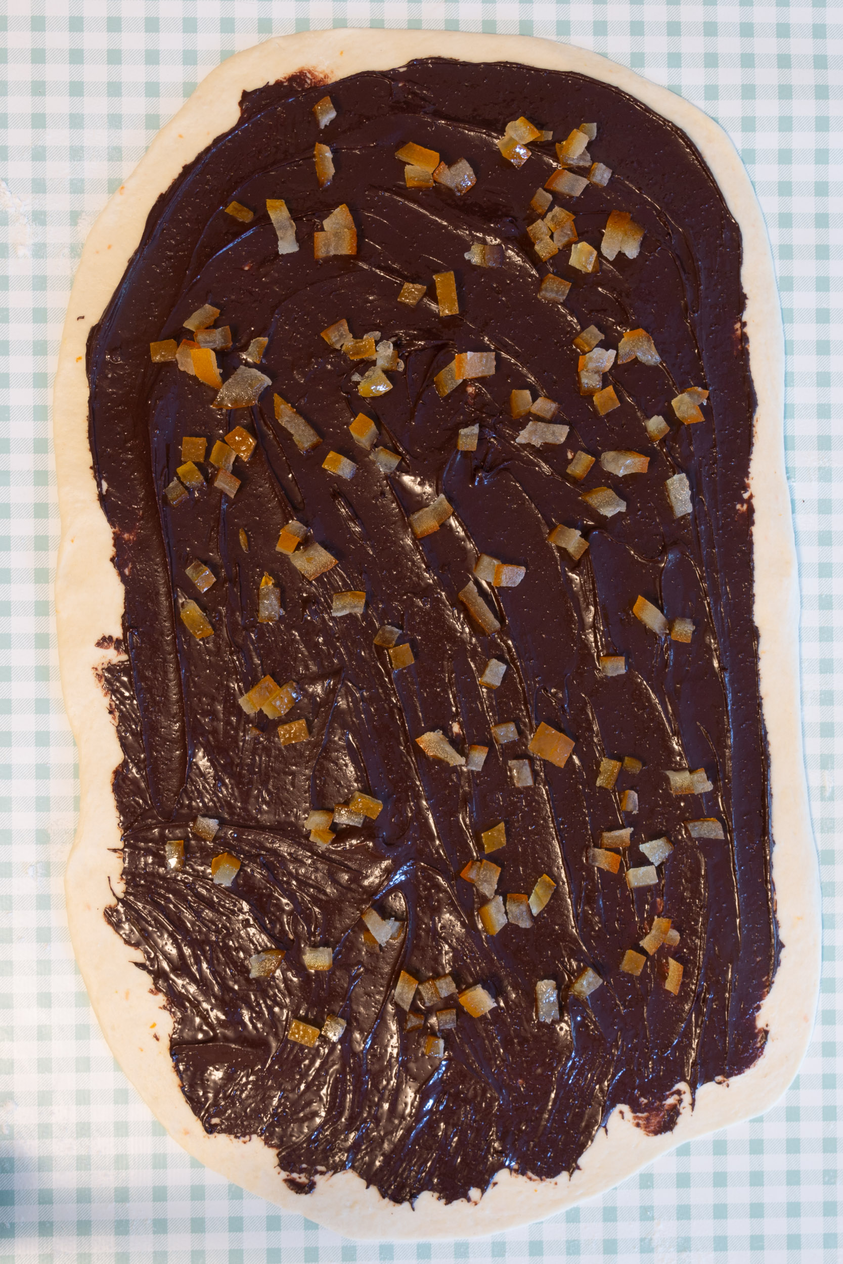 Étalez sur chaque rectangle de pâte la pâte à tartiner, et parsemez de petits cubes d’écorces d’oranges confites. Si vous n’avez pas de pâte à tartiner, vous pouvez faire une ganache au chocolat en faisant fondre 100g de chocolat dans 100g de crème de soja. Laissez refroidir au maximum le mélange avant de l’étaler sur la pâte pour ne pas abimer la pâte à brioche.