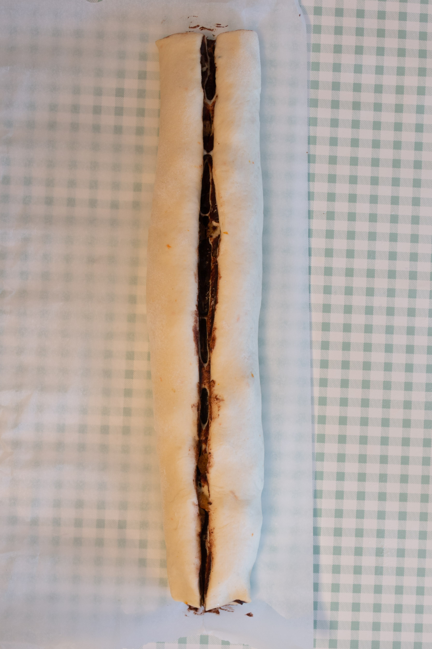 Roulez la pâte sur elle même sur la longueur, puis, coupez là en deux sur sa longueur également. Tournez chaque morceau vers le haut, pour que la garniture soit apparente, et enroulez chaque morceaux l’un sur l’autre comme pour faire une tresse à deux brins.